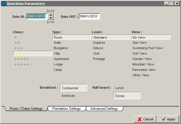 Quotation Parameters: To precise the traveller desires. D+15 and D-15 quotations are available.